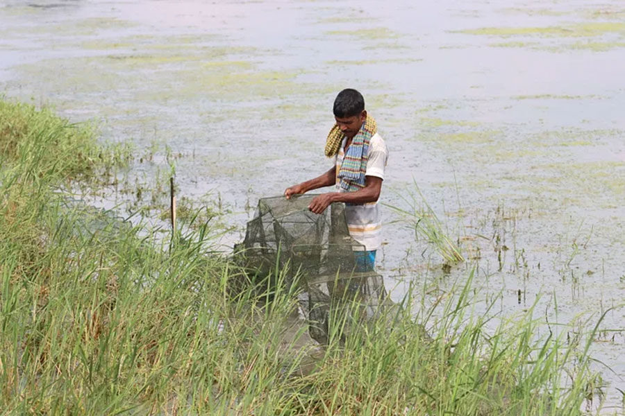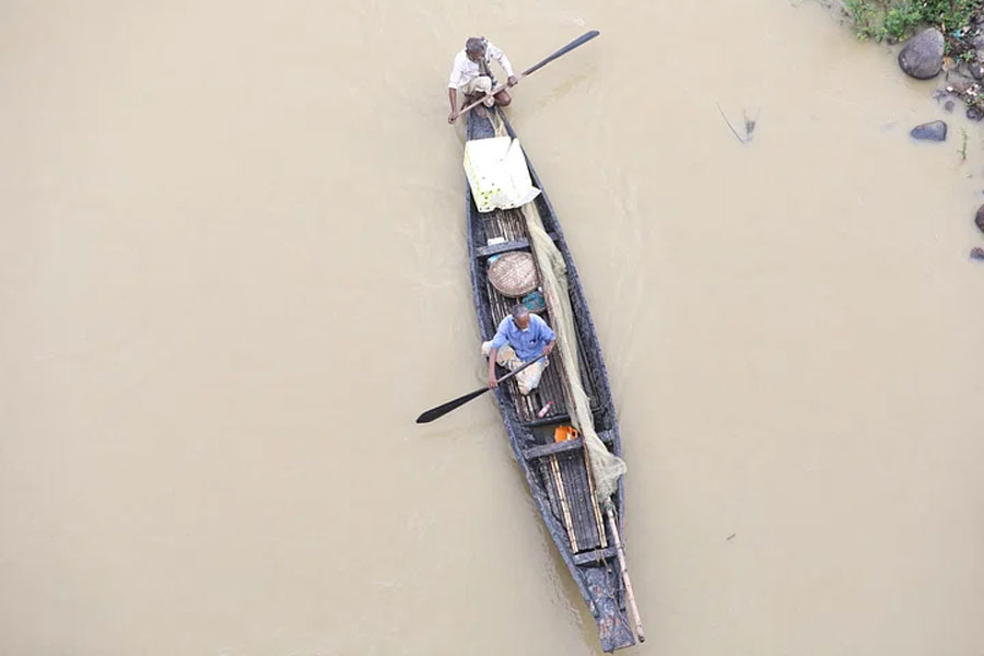কোলের শিশুকে কাঁধে নিয়ে বন্যার পানি ভেঙে ত্রাণের খোঁজে যাচ্ছেন এক ব্যক্তি। জোগানিয়া কান্দাপাড়া, নালিতাবাড়ী