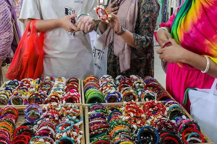 মেলার স্টল ঘুরে ঘুরে পছন্দের পণ্য দেখছেন ক্রেতারা।